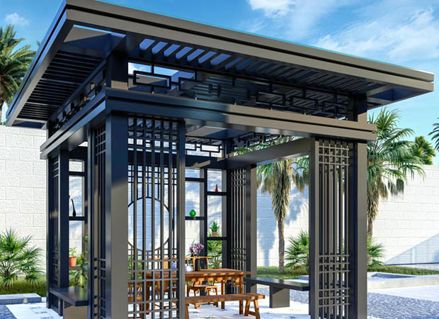 1、新中式鋁合金涼亭安裝簡(jiǎn)單,施工便捷,不需要繁雜的施工工藝,節(jié)省安裝時(shí)間和費(fèi)用。