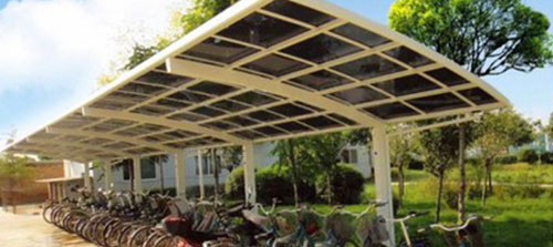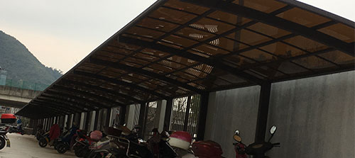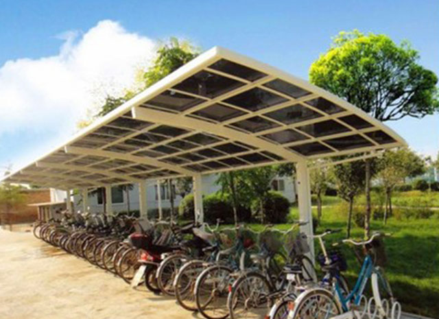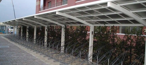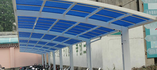鋁合金自行車車棚頂棚能夠抵擋90%的紫外線,有效預制紫外線對車輛的傷害,延長車輛的使用壽命